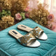 A soft nude base meets a burst of 3D golden and ivory floral embellishments with gold-toned rivets.