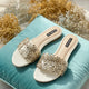 Silver slip-ons inspired by macramé artistry, featuring intricate golden swirl detailing for a handcrafted, luxurious touch.